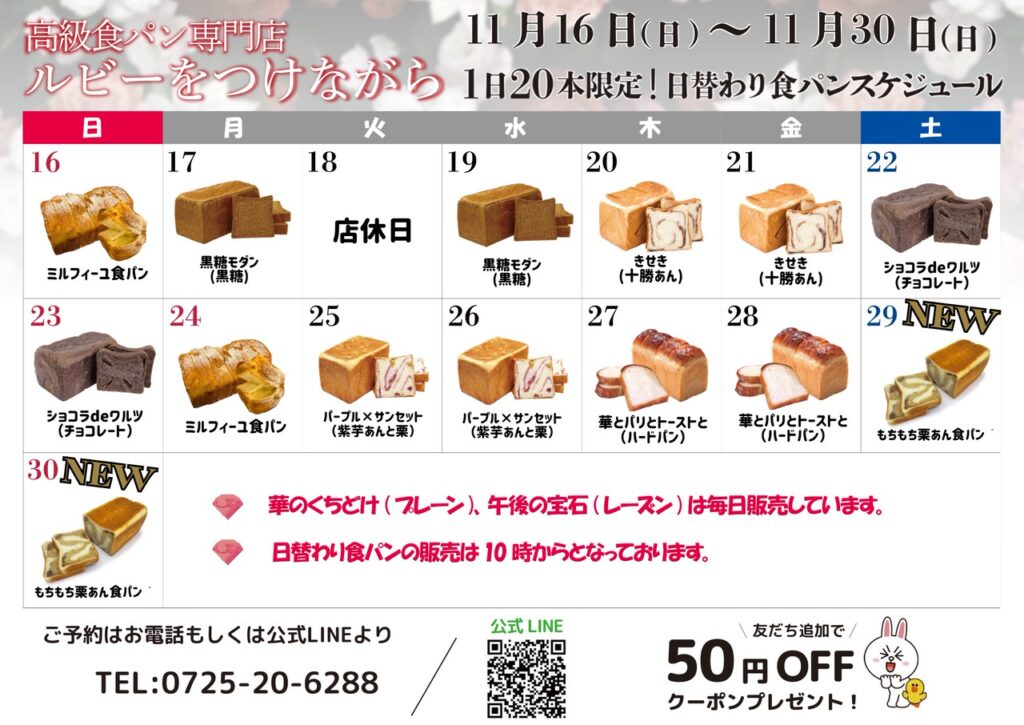 ご予約がおススメ! 2025年11月13日 パンスケジュール最新&最速はLINEお友達追加がおススメ!ココをタップ♪♪ 当店は、毎月1日~15日(前半)、16日~30日or31日(後半)の2回に分けて日替わり食パン販売スケジュールを公開いたします。最速、最新情報はLINEお友達追加がおススメです。ただ今、11月後半&12月前半の販売スケジュールを公開中です。11月29~30日『新商品!もちもち栗あん食パン』